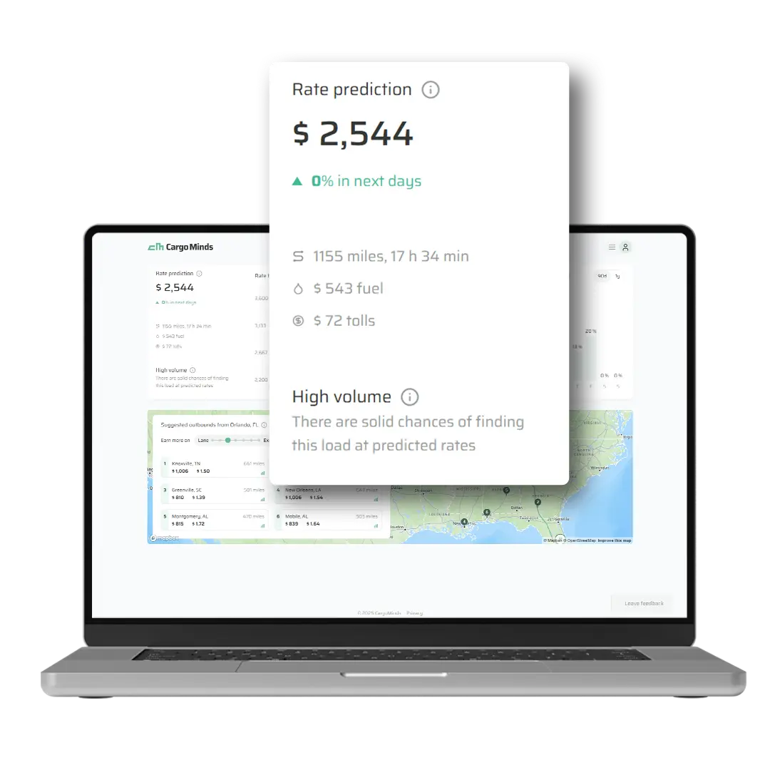 CargoMinds is an AI-driven platform that analyzes real-time data and historical trends to recommend the most profitable loads and optimal routes, saving your team hours while boosting revenue.